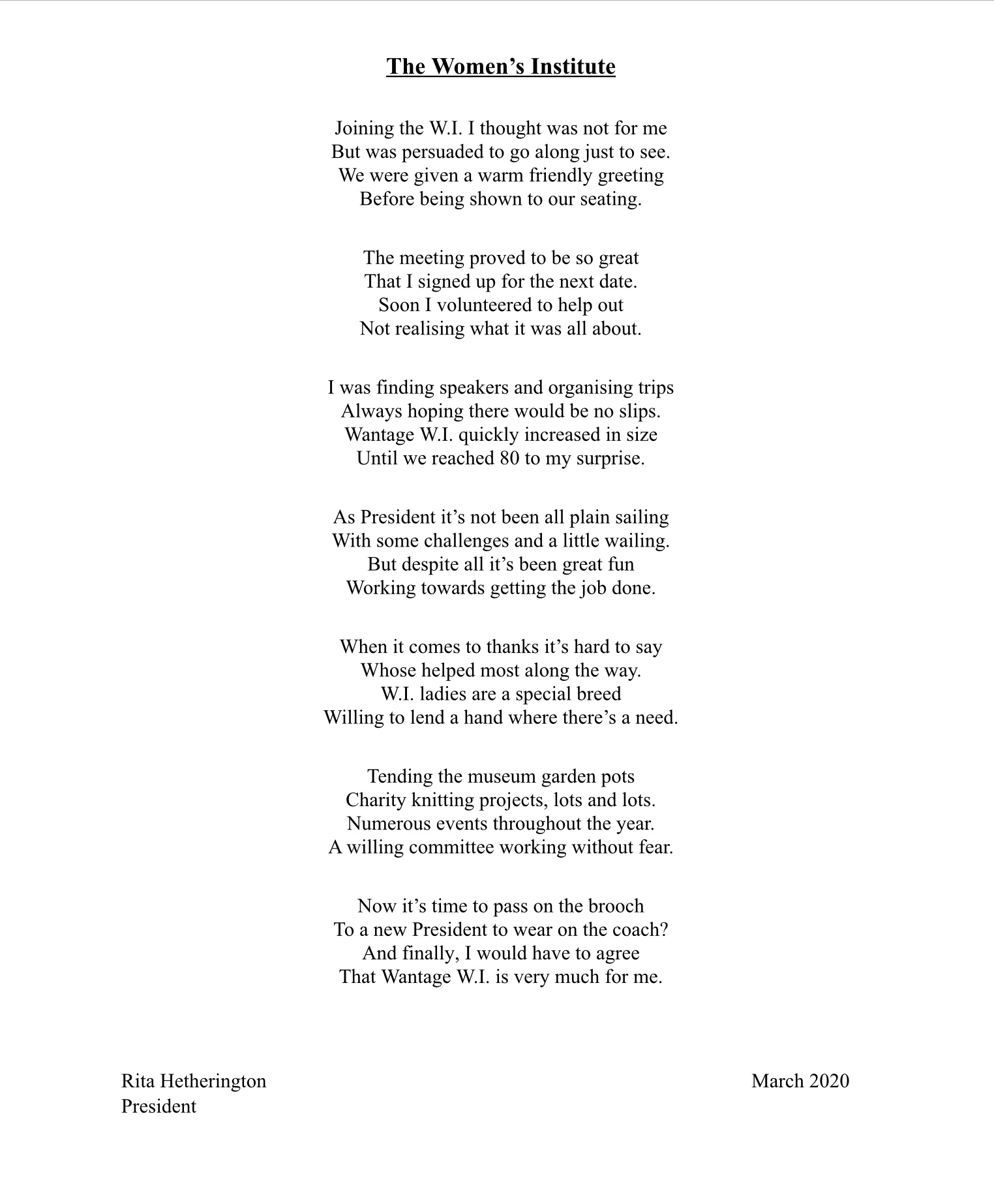 Our annual meeting was a great success however it was with sadness we said goodbye from the committee to Lyn, who had been our news and views lady and Sue had been our programme Secretary. We also said bye bye to Rita as President. A message from our out going presidentI was hoping to speak to you all in person at our next meeting, but that may be a long time coming.